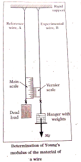 Measurement of Young's Modulus of Elasticity (Y)Young's Modulus of elasticity Y of a material (wire) can be measured in the laboratory by using vernier apparatus as shown in the figure.
